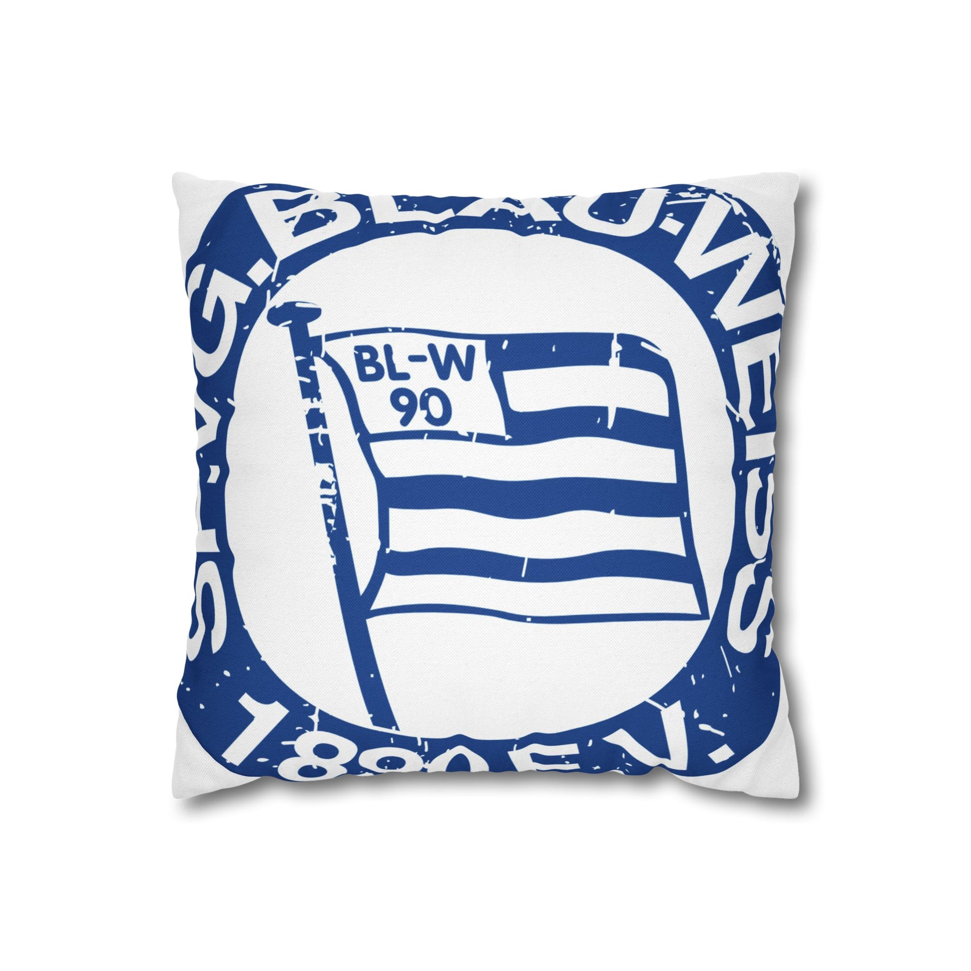Bringen Sie Berliner Fußballnostalgie in Ihr Zuhause – mit diesem quadratischen Kissenbezug im Vintage-Look. Der doppelseitige Print zeigt das distressed Blau-Weiß 90 Berlin Vereinslogo, inspiriert von klassischen Retro-Fanartikeln: authentisch, markant und lässig gealtert. Das robuste Spun-Polyester bleibt formstabil und knitterfrei, während der verdeckte Reißverschluss in Beige eine saubere, hochwertige Kante schafft und das Vereinslogo optimal in Szene setzt. Perfekt, um Sofas, Leseecken oder Fanräume mit echter Berliner Fußballgeschichte zu bereichern.